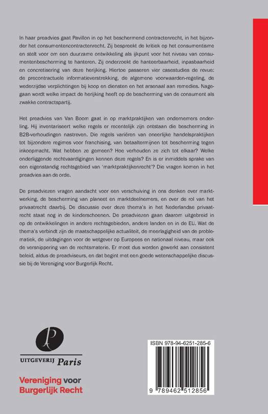 Het preadvies van Van Boom gaat in op marktpraktijken van ondernemers onderling. Hij inventariseert welke regels er recentelijk zijn ontstaan die bescherming in B2B-verhoudingen nastreven. Die regels variëren van oneerlijke handelspraktijken tot bijzondere regimes voor franchising, van betaaltermijnen tot bescherming tegen inkoopmacht. Wat hebben ze gemeen? Hoe verhouden ze zich tot elkaar? Welke onderliggende rechtvaardigingen kennen deze regels? En is er inmiddels sprake van een eigenstandig rechtsgebied van ‘marktpraktijkenrecht’? Die vragen komen in het preadvies aan de orde.