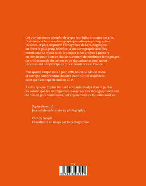 Chantal Nedjib, consultante en image par la photographie, et Sophie Bernard, journaliste spécialisée en photographie, se sont associées pour écrire un guide pratique des prix, résidences, bourses et autres récompenses professionnelles dédiées à la photographie. Ce livre s’adresse principalement aux photographes et mécènes, et plus largement à l’écosystème de la photographie. Un ouvrage mode d’emploi pour décrypter les règles et usages des prix afin d’en tirer le plus grand bénéfice et éviter les pièges. Pourquoi une nouvelle édition ? Après une première édition parue en 2019 réalisée sur la base d’une étude auprès de soixante-dix professionnels, Sophie Bernard et Chantal Nedjib proposent une deuxième édition complétée d’un chapitre sur les Résidences. Des interviews supplémentaires enrichissent l’ouvrage. L’inventaire des prix recensés a été mis à jour et une liste des principales résidences a été ajoutée. Pour étayer leurs points de vue, elles ont interrogé 200 professionnels – responsables d’institutions, commissaires d’exposition, éditeurs, galeries, photographes, observateurs, mécènes, journalistes et collectionneurs – sur l’impact des principaux prix français reconnus dans le secteur de la photographie. 70 d'entre eux ont apporté leurs éclairages et commentaires : - Quels regards ces acteurs portent-ils sur les prix ? - Comment évaluer la qualité et le succès d’un prix ? - Quels bénéfices en tirent les entreprises, mécènes partenaires, photographes, institutions, galeries, festivals, etc.? Toujours conçue comme un guide pratique, cette deuxième version dresse une typologie des résidences. Elle examine les points à maitriser pour bien les choisir, y postuler et bien les concevoir.Â