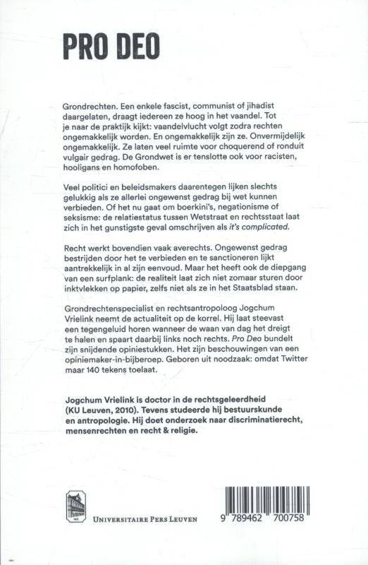 Over de onvermijdelijke ongemakken van grondwettelijke vrijheid. Grondrechten. Een enkele fascist, communist of jihadist daargelaten, draagt iedereen ze hoog in het vaandel. Tot je naar de praktijk kijkt: vaandelvlucht volgt zodra rechten ongemakkelijk worden. En ongemakkelijk zijn ze. Onvermijdelijk ongemakkelijk. Ze laten veel ruimte voor choquerend of ronduit vulgair gedrag. De Grondwet is er tenslotte ook voor racisten, hooligans en homofoben. Veel politici en beleidsmakers daarentegen lijken slechts gelukkig als ze allerlei ongewenst gedrag bij wet kunnen verbieden. Of het nu gaat om boerkini’s, negationisme of seksisme: de relatiestatus tussen Wetstraat en rechtsstaat laat zich in het gunstigste geval omschrijven als it’s complicated. Recht werkt bovendien vaak averechts. Ongewenst gedrag bestrijden door het te verbieden en te sanctioneren heeft de aantrekkingskracht van de eenvoud. Maar het heeft ook de diepgang van een surfplank: de realiteit laat zich niet zomaar sturen door inktvlekken op papier. Grondrechtenspecialist en rechtsantropoloog Jogchum Vrielink neemt de actualiteit op de korrel. Hij laat steevast een tegengeluid horen wanneer de waan van dag het dreigt te halen en spaart daarbij links noch rechts. Pro Deo bundelt zijn snijdende opiniestukken. Het zijn beschouwingen van een opiniemaker-in-bijberoep. Geboren uit noodzaak: omdat Twitter maar 140 tekens toelaat.