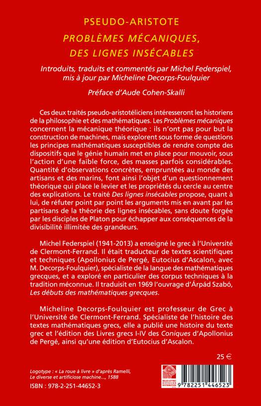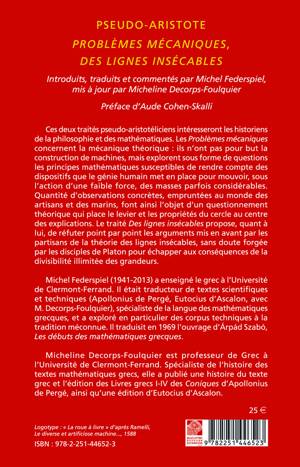 Ces deux traites pseudo-aristoteliciens interesseront les historiens de la philosophie et des mathematiques. Les Problemes mecaniques concernent la mecanique theorique: ils n'ont pas pour but la construction de machines, mais explorent sous forme de questions les principes mathematiques susceptibles de rendre compte des dispositifs que le genie humain met en place pour mouvoir, sous l'action d'une faible force, des masses parfois considerables. Quantite d'observations concretes, empruntees au monde des artisans et des marins, font ainsi l'objet d'un questionnement theorique qui place le levier et les proprietes du cercle au centre des explications. Le traite Des lignes insecables propose, quant a lui, de refuter point par point les arguments mis en avant par les partisans de la theorie des lignes insecables, sans doute forgee par les disciples de Platon pour echapper aux consequences de la divisibilite illimitee des grandeurs.