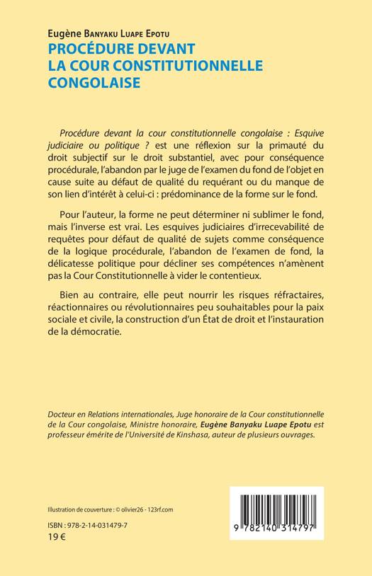 4 Couv Procédure devant la cour constitutionnelle congolaise: esquive judiciaire ou politique ? est une réflexion sur la primauté du droit subjectif sur le droit substantiel, avec pour conséquence procédurale, l abandon par le juge de l examen du fond de l objet en cause suite au défaut de qualité du requérant ou du manque de son lien d intérêt à celui-ci: prédominance de la forme sur le fond. Pour l auteur, la forme ne peut déterminer ni sublimer le fond, mais l inverse est vrai. Les esquives judiciaires d irrecevabilité de requêtes pour défaut de qualité de sujets comme conséquence de la logique procédurale, l abandon de l examen de fond, la délicatesse politique pour décliner ses compétences n amène pas la Cour Constitutionnelle à vider le contentieux. Bien au contraire, elle peut nourrir les risques réfractaires, réactionnaires ou révolutionnaires peu souhaitables pour la paix sociale et civile, la construction d un État de droit et l instauration de la démocratie.