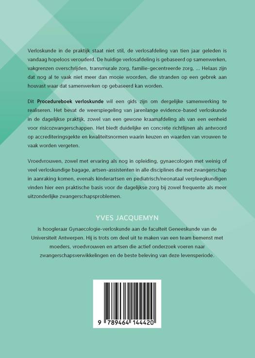 Verloskunde in de praktijk staat niet stil, de verlosafdeling van tien jaar geleden is vandaag hopeloos verouderd. De huidige verlosafdeling is gebaseerd op samenwerken, vakgrenzen overschrijden, transmurale zorg, familie-gecentreerde zorg, … Helaas zijn dat nog al te vaak niet meer dan mooie woorden, die stranden op een gebrek aan houvast waar dat samenwerken op gebaseerd kan worden. Dit Procedureboek verloskunde wil een gids zijn om dergelijke samenwerking te realiseren. Het bevat de weerspiegeling van jarenlange evidence-based verloskunde in de dagelijkse praktijk, zowel van een gewone kraamafdeling als van een eenheid voor risicozwangerschappen. Het biedt duidelijke en concrete richtlijnen als antwoord op accrediteringsgekte en kwaliteitsnormen waarin keuzen en waarden van vrouwen te vaak worden vergeten. Vroedvrouwen, zowel met ervaring als nog in opleiding, gynaecologen met weinig of veel verloskundige bagage, artsen-assistenten in alle disciplines die met zwangerschap in aanraking komen, evenals kinderartsen en pediatrisch/neonataal verpleegkundigen vinden hier een praktische basis voor de dagelijkse zorg bij zowel frequente als meer uitzonderlijke zwangerschapsproblemen.