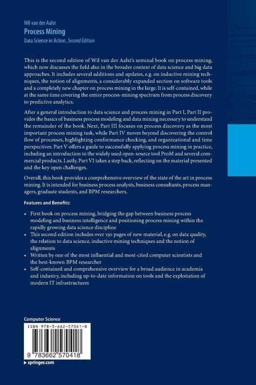 After a general introduction to data science and process mining in Part I, Part II provides the basics of business process modeling and data mining necessary to understand the remainder of the book. Next, Part III focuses on process discovery as the most important process mining task, while Part IV moves beyond discovering the control flow of processes, highlighting conformance checking, and organizational and time perspectives. Part V offers a guide to successfully applying process mining in practice, including an introduction to the widely used open-source tool ProM and several commercial products. Lastly, Part VI takes a step back, reflecting on the material presented and the key open challenges.
