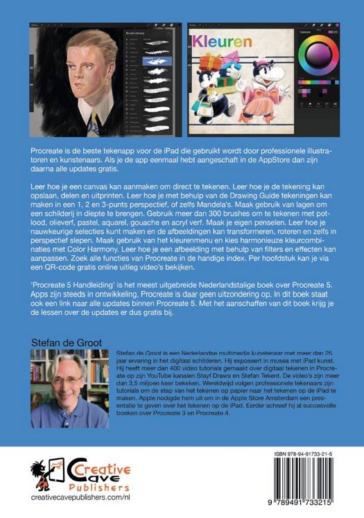 Over de auteur Stefan de Groot is een Nederlandse multimedia kunstenaar met meer dan 25 jaar ervaring in het digitaal schilderen. Hij exposeert in musea met iPad kunst. Hij heeft meer dan 400 video tutorials gemaakt over digitaal tekenen in Procreate op zijn YouTube kanalen Stayf Draws en Stefan Tekent. De video’s zijn meer dan 3,5 miljoen keer bekeken. Wereldwijd volgen professionele tekenaars zijn tutorials om de stap van het tekenen op papier naar het tekenen op de iPad te maken. Apple nodigde hem uit om in de Apple Store Amsterdam een presentatie te geven over het tekenen op de iPad. Eerder schreef hij al succesvolle boeken over Procreate 3 en Procreate 4.