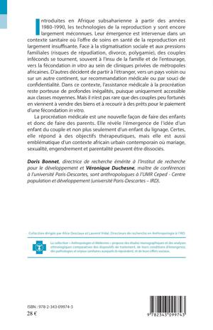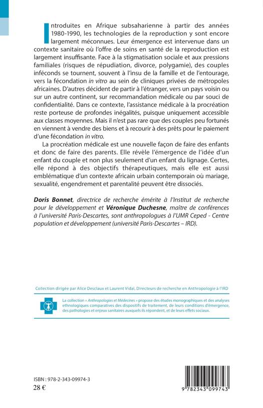 Cet ouvrage analyse la portée de l'émergence de la procréation médicale en Afrique subsaharienne. Le contexte dans lequel elle a émergé, les populations et les conditions d'accès. La stigmatisation sociale liée à l'infertilité a poussé des couples à recourir à la fécondation assistée mais les inégalités sociales ont réduit cet accès aux classes moyennes. La procréation médicale est une nouvelle façon de faire des enfants et donc de faire des parents. Elle révèle l'émergence de l'idée d'un enfant du couple et non plus seulement d'un enfant du lignage. Elle répond à des objectifs thérapeutiques, mais elle est aussi emblématique d'un contexte africain urbain contemporain en forte évolution.