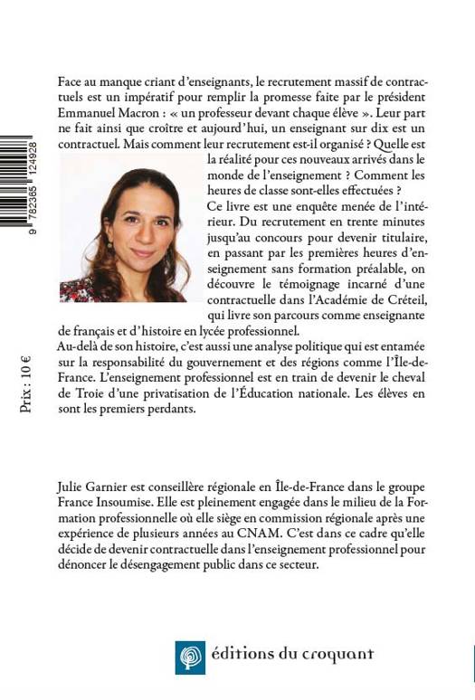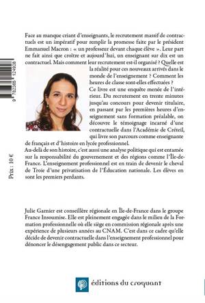 Face au manque criant d’enseignants, le recrutement massif de contractuels est un impératif pour remplir la promesse faite par le président Emmanuel Macron : « un professeur devant chaque élève ». Leur part ne fait ainsi que croître et aujourd’hui, un enseignant sur dix est un contractuel. Mais comment leur recrutement est-il organisé ? Quelle est la réalité pour ces nouveaux arrivés dans le monde de l’enseignement ? Comment les heures de classe sont-elles effectuées ? Ce livre est une enquête menée de l’intérieur. Du recrutement en trente minutes jusqu’au concours pour devenir titulaire, en passant par les premières heures d’enseignement sans formation préalable, on découvre le témoignage incarné d’une contractuelle dans l’Académie de Créteil, qui livre son parcours comme enseignante de français et d’histoire en lycée professionnel. Au-delà de son histoire, c’est aussi une analyse politique qui est entamée sur la responsabilité du gouvernement et des régions comme l’Île-de-France. L’enseignement professionnel est en train de devenir le cheval de Troie d’une privatisation de l’Éducation Nationale. Les élèves sont les premiers perdants de ce nouveau marché qui s’ouvre pour des organismes peu scrupuleux. Pendant que des lycées professionnels ferment leur porte, des millions sont donnés à des acteurs privés sans véritable contrôle. Le résultat est sans appel : pas une seule année ne passe sans qu’un scandale éclate ! Et pendant ce temps, les responsables politiques regardent ailleurs et refusent de défendre un service public de l’éducation fort et ambitieux. A l’heure des défis sociaux, écologiques et internationaux, notre richesse repose pourtant sur les savoirs et compétences transmis aux générations de demain. Face au désengagement public, n’y a-t-il pas finalement une volonté inavouée de la part des dirigeants : confier les clés de l’enseignement professionnel aux entreprises plutôt qu’à l’École ?