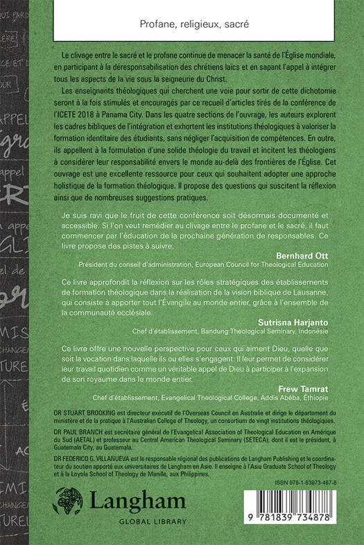 Les enseignants théologiques qui cherchent une voie pour sortir de cette dichotomie seront à la fois stimulés et encouragés par ce recueil d'articles tirés de la conférence de l'ICETE 2018 à Panama City. Dans les quatre sections de l'ouvrage, les auteurs explorent les cadres bibliques de l'intégration et exhortent les institutions théologiques à valoriser la formation identitaire des étudiants, sans négliger l'acquisition de compétences. En outre, ils appellent à la formulation d'une solide théologie du travail et incitent les théologiens à considérer leur responsabilité envers le monde au-delà des frontières de l'Église. Cet ouvrage est une excellente ressource pour ceux qui souhaitent adopter une approche holistique de la formation théologique. Il propose des questions qui suscitent la réflexion ainsi que de nombreuses suggestions pratiques.