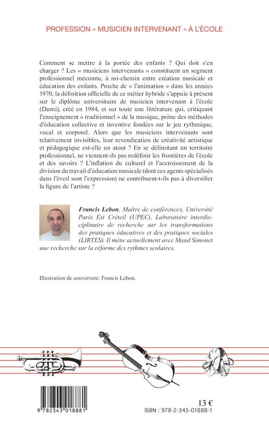 Les musiciens intervenants constituent un segment professionnel méconnu, entre création musicale et éducation des enfants. La définition officielle s'appuie à présent sur le diplôme universitaire de musicien intervenant à l'école (1984), et sur toute une littérature qui prône des méthodes d'éducation collective fondées sur le jeu rythmique, vocal et corporel. Cet ouvrage pose les questions essentielles sur ce métier hybride, notamment sur la définition des frontières de l'école et de l'artiste.