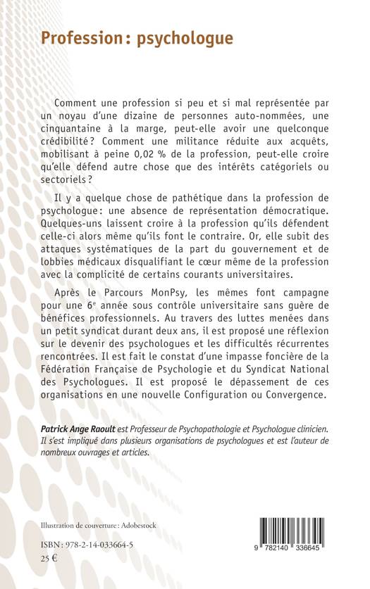 Comment une profession si peu et si mal représentée par un noyau d'une dizaine de personnes auto-nommées, une cinquantaine à la marge, peut-elle avoir une quelconque crédibilité ? Comment une militance réduite aux acquêts, mobilisant à peine 0,02 % de la profession, peut-elle croire qu'elle défend autre chose que des intérêts catégoriels ou sectoriels ? Il y a quelque chose de pathétique dans la profession de psychologue : une absence de représentation démocratique. Quelques-uns laissent croire à la profession qu'ils défendent celle-ci alors même qu'ils font le contraire. Or, elle subit des attaques systématiques de la part du gouvernement et de lobbies médicaux disqualifiant le cœur même de la profession avec la complicité de certains courants universitaires. Après le Parcours MonPsy, les mêmes font campagne pour une 6e année sous contrôle universitaire sans guère de bénéfices professionnels. Au travers des luttes menées dans un petit syndicat durant deux ans, il est proposé une réflexion sur le devenir des psychologues et les difficultés récurrentes rencontrées. Il est fait le constat d'une impasse foncière de la Fédération Française de Psychologie et du Syndicat National des Psychologues. Il est proposé le dépassement de ces organisations en une nouvelle Configuration ou Convergence.