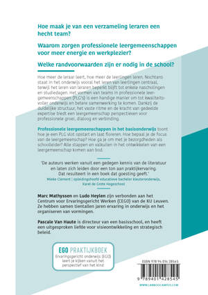 EGO praktijkboek Ervaringsgericht onderwijs (EGO) leert je kijken vanuit het perspectief van het kind Hoe meer de leraar leert, hoe meer de leerlingen leren. Nochtans staat in het onderwijs vooral het leren van leerlingen centraal, terwijl het leren van leraren beperkt blijft tot enkele nascholingen en studiedagen. Het vormen van teams in professionele leergemeenschappen (PLG's) is een handige manier om tot kwaliteitsvoller onderwijs en betere samenwerking te komen. Dankzij de duidelijke structuur, het vaste ritme en de kracht van gedeelde expertise biedt een leergemeenschap perspectieven voor professionele groei, dialoog en verbinding. Professionele leergemeenschappen in het basisonderwijs toont hoe je een PLG vlot opstart en laat floreren. Hoe bepaal je de focus van de leergemeenschap? Hoe ga je om met je bezorgdheden als schoolleider? Alle stappen en valkuilen in het ontwikkelen van een leergemeenschap komen aan bod.