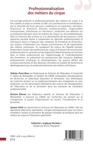 Cet ouvrage présente la professionnalisation des métiers du cirque à la fois comme un enjeu et comme un défi. Il conduit une réflexion sur la professionnalisation dans les métiers du cirque, sur les problématiques liées à l’insertion des artistes ou à la réorientation de leur parcours. Les auteurs s’intéressent aux risques psychosociaux et de taylorisation des métiers artistiques, aux enjeux de l'égalité homme-femme et aux besoins de reconversion professionnelle.