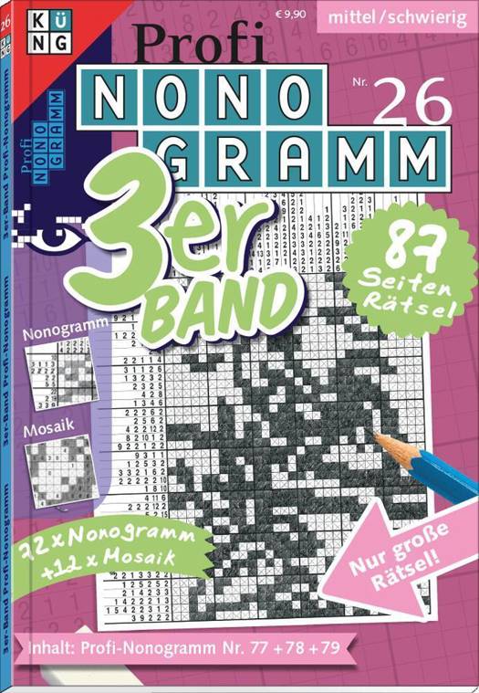 Im Profi-Nonogramm 3er-Band Nr. 26 sind drei Ausgaben des Magazins Profi-Nonogramm aus dem Küng Rätsel Sortiment zusammengebunden. Insgesamt umfasst der 3er-Band 72 Nonogramm-Rätsel in schwarzweiss in größerem Format. Dieses visuelle Rätsel ist auch bekannt als Pic-a-pix, Hanjie oder O Ekaki. Nonogramm bietet mehr als übliche Rätsel: Sie sind auch kleine Kunstwerke. Dies, weil mit jedem gelösten Rätsel auch ein Bild entsteht. Sie werden beim Lösen zum Zeichner. Die Zahlen um das Rätselgitter geben an, wo die Flächen liegen, die auszumalen sind. Das ist leicht erklärt, kann aber recht anspruchsvoll sein. Dazu sind in diesem Sammelband auch 12 Mosaik-Rätsel. Profi-Nonogramm 3er-Band Nr. 26 beinhaltet die Hefte Profi-Nonogramm Nr. 77, 78 und 79.