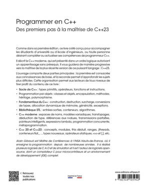 Un guide du C++ dans sa plus récente version (C++23). L’ouvrage offre les connaissances de base (sans prérequis) et un approfondissement sur les sujets plus difficiles.