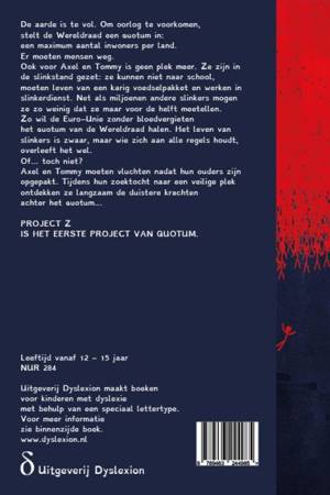 De aarde is te vol. Om oorlog te voorkomen, stelt de Wereldraad een quotum in: een maximum aantal inwoners per land. Er moeten mensen weg. Ook voor Axel en Tommy is geen plek meer. Ze zijn in de slinkstand gezet: ze kunnen niet naar school, moeten leven van een karig voedselpakket en werken in slinkerdienst. Net als miljoenen andere slinkers mogen ze zo weinig dat ze maar voor de helft meetellen. Zo wil de Euro-Unie zonder bloedvergieten het quotum van de Wereldraad halen. Het leven van slinkers is zwaar, maar wie zich aan alle regels houdt, overleeft het wel. Of... toch niet? Axel en Tommy moeten vluchten nadat hun ouders zijn opgepakt. Tijdens hun zoektocht naar een veilige plek ontdekken ze langzaam de duistere krachten achter het quotum... PROJECT Z IS HET EERSTE PROJECT VAN QUOTUM.