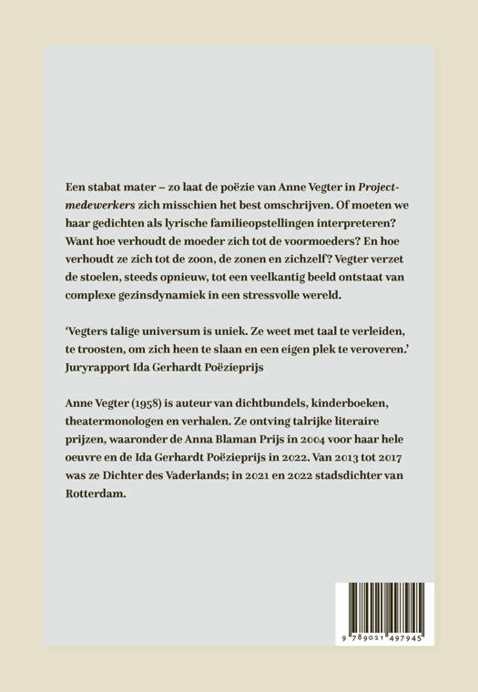 Een stabat mater – zo laat de poëzie van Anne Vegter in Projectmedewerkers zich misschien het best omschrijven. Of moeten we haar gedichten als lyrische familieopstellingen interpreteren? Want hoe verhoudt de moeder zich tot de voormoeders? En hoe verhoudt ze zich tot de zoon, de zonen en zichzelf? Vegter verzet de stoelen, steeds opnieuw, tot een veelkantig beeld ontstaat van complexe gezinsdynamiek in een stressvolle wereld.