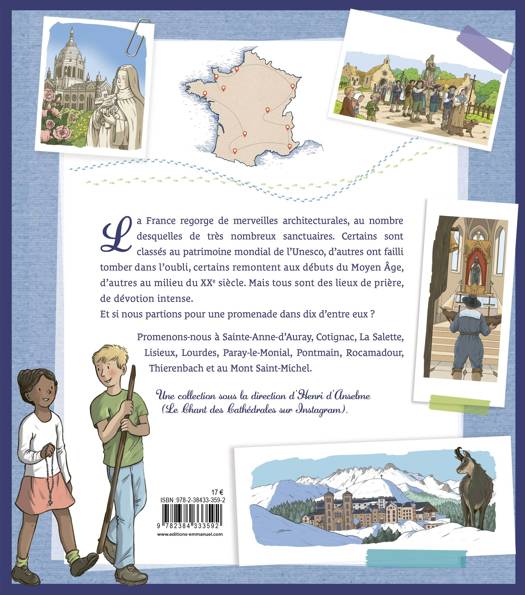 La France regorge de merveilles architecturales, au nombre desquelles de très nombreux sanctuaires. Certains sont classés au patrimoine mondial de l’Unesco, d’autres ont failli tomber dans l’oubli, certains remontent aux débuts du Moyen Âge, d’autres au milieu du XXe siècle. Mais tous sont des lieux de prière, de dévotion intense. Et si nous partions pour une promenade dans dix d’entre eux ? Promenons-nous, dans cet album documentaire mêlant illustrations et photos, à Sainte-Anne-d’Auray, Cotignac, La Salette, Lisieux, Lourdes, Paray-le-Monial, Pontmain, Rocamadour, Thierenbach et au Mont Saint-Michel. Une collection sous la direction d’Henri d’Anselme ((Le Chant des Cathédrales sur Instagram).
