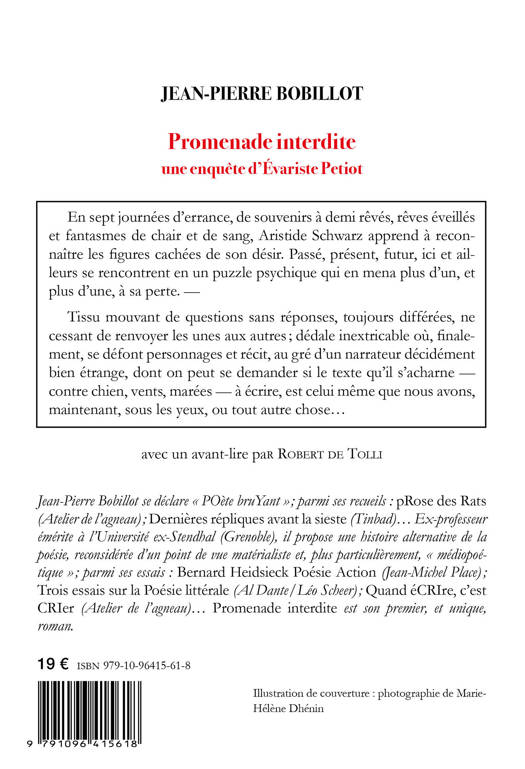 « En sept journées d’errance, de souvenirs à demi rêvés, rêves éveillés et fantasmes de chair et de sang, Aristide Schwarz apprend à reconnaître les figures cachées de son désir. Passé, présent, futur, ici et ailleurs se rencontrent en un puzzle psychique qui en mena plus d’un, et plus d’une, à sa perte. — Tissu mouvant de questions sans réponses, toujours différées, ne cessant de renvoyer les unes aux autresâ; dédale inextricable où, finalement, se défont personnages et récit, au gré d’un narrateur décidément bien étrange, dont on peut se demander si le texte qu’il s’acharne — contre chien, vents, marées — à écrire, est celui même que nous avons, maintenant, sous les yeux, ou tout autre chose... » Incitant à plusieurs modes de lecture, tentative de suggestion poétique d’« un film mental » (se déroulant, censément, dans l’esprit du lecteur, des personnages, du seul protagoniste de l’histoire, ou de lui-même écrivant ?), Promenade interdite est aussi l’énoncé d’une balade dans un genre que s’était interdit jusques ici l’auteur : le roman, la fiction. Il y a bien des personnages, des lieux, un déroulement (7 « journées »), des dialogues, de la narration, de la description, etc. ; il y a bien une île (« Belle-épave »), mais on ne sait trop où, ni quand ; il y a bien un « il » (Aristide), mais on ne sait d’où venu, ni quand, ni pourquoi (le sait-il lui-même ?) ; une « Elle » (« la Sorcière »), qui semble être l’immémoriale meneuse d’un jeu dont personne ne connaît les règles ; d’autres « ils » sont non moins suspects... Que se passe-t-il vraiment ? C’est au lecteur de tirer les nombreux fils de la fiction, trame romanesque interloquante...