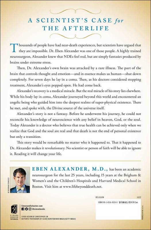 The #1 New York Times bestselling account of a neurosurgeon's own near-death experience--for readers of 7 Lessons from Heaven. Thousands of people have had near-death experiences, but scientists have argued that they are impossible. Dr. Eben Alexander was one of those scientists. A highly trained neurosurgeon, Alexander knew that NDEs feel real, but are simply fantasies produced by brains under extreme stress. Then, Dr. Alexander's own brain was attacked by a rare illness. The part of the brain that controls thought and emotion--and in essence makes us human--shut down completely. For seven days he lay in a coma. Then, as his doctors considered stopping treatment, Alexander's eyes popped open. He had come back.
