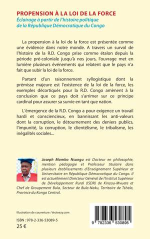 La propension à la loi de la force est présentée comme une évidence dans notre monde. A travers un survol de l'histoire de la R.D. Congo prise comme étalon depuis la période pré-coloniale jusqu'à nos jours, l'ouvrage met en lumière plusieurs événements qui relatent que le pays n'a fait que subir la loi de la force. Partant d'un raisonnement syllogistique dont la prémisse majeure est l'existence de la loi de la force, les exemples décortiqués pour la R.D. Congo amènent à la conclusion que ce pays doit s'arrimer sur ce principe cardinal pour assurer sa survie en tant que nation. L'émergence de la R.D. Congo a pour exigence un travail hardi et consciencieux, en bannissant les anti-valeurs dont la corruption, le détournement des deniers publics, l'impunité, la corruption, le clientélisme, le tribalisme, les inégalités sociales...
