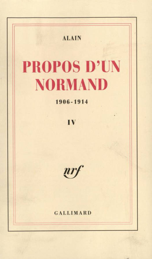 Émile Chartier (1868-1951), qui signait Alain, a publié à l'intention des lecteurs de divers journaux cinq mille "Propos" , dans l'intention avouée de "relever l'entrefilet au niveau de la métaphysique". Éloigné de tout esprit de système, il a exposé dans un style d'une rare clarté sa vision de l'homme, être d'imagination et de passion, en charge d'âme, c'est-à-dire de lui-même. Les Propos d'un Normand rassemblent en cinq tomes les billets quotidiens qu'il donnait à La Dépêche de Rouen.