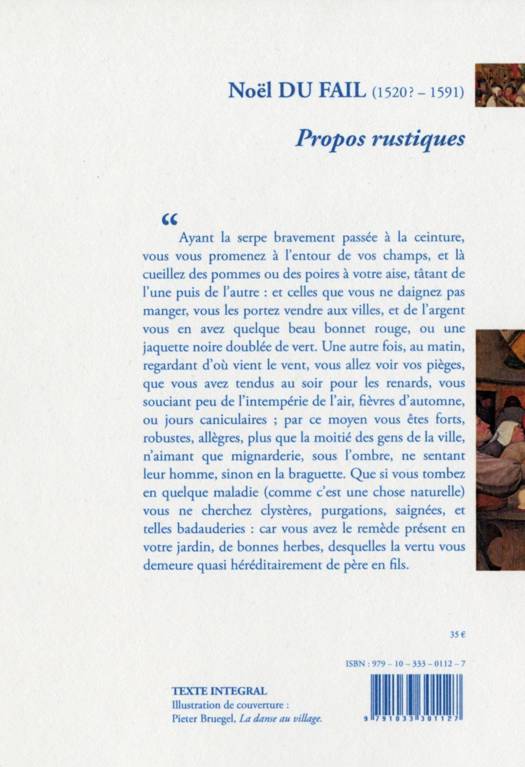 « Ayant la serpe bravement passée à la ceinture, vous vous promenez à l'entour de vos champs, et là cueillez des pommes ou des poires à votre aise, tâtant de l'une puis de l'autre : et celles que vous ne daignez pas manger, vous les portez vendre aux villes, et de l'argent vous en avez quelque beau bonnet rouge, ou une jaquette noire doublée de vert. Une autre fois, au matin, regardant d'où vient le vent, vous allez voir vos pièges, que vous avez tendus au soir pour les renards, vous souciant peu de l'intempérie de l'air, fièvres d'automne, ou jours caniculaires ; par ce moyen vous êtes forts, robustes, allègres, plus que la moitié des gens de la ville, n'aimant que mignarderie, sous l'ombre, ne sentant leur homme, sinon en la braguette. Que si vous tombez en quelque maladie (comme c'est une chose naturelle) vous ne cherchez clystères, purgations, saignées, et telles badauderies : car vous avez le remède présent en votre jardin, de bonnes herbes, desquelles la vertu vous demeure quasi héréditairement de père en fils.