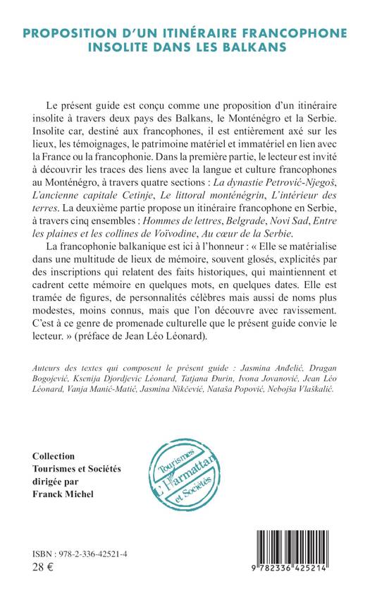 Le présent guide est conçu comme une proposition d'un itinéraire insolite à travers deux pays des Balkans, le Monténégro et la Serbie. Insolite car, destiné aux francophones, il est entièrement axé sur les lieux, les témoignages, le patrimoine matériel et immatériel en lien avec la France ou la francophonie. Dans la première partie, le lecteur est invité à découvrir les traces des liens avec la langue et culture francophones au Monténégro, à travers quatre sections La dynastie Petrovic-Njegos, L'ancienne capitale Cetinje, Le littoral monténégrin, L'intérieur des terres. La deuxième partie propose un itinéraire francophone à travers la Serbie, à travers cinq ensembles Hommes de lettres, Belgrade, Novi Sad, Entre les plaines et les collines de Voïvodine, Au coeur de la Serbie. La francophonie balkanique est ici à l'honneur Elle se matérialise dans une multitude de lieux de mémoire, souvent glosés, explicités par des inscriptions qui relatent des faits historiques, qui maintiennent et cadrent cette mémoire en quelques mots, en quelques dates. Elle est tramée de figures, de personnalités célèbres mais aussi de noms plus modestes, moins connus, mais que l'on découvre avec ravissement. C'est à ce genre de promenade culturelle que le présent guide convie le lecteur. (préface de Jean Léo Léonard).