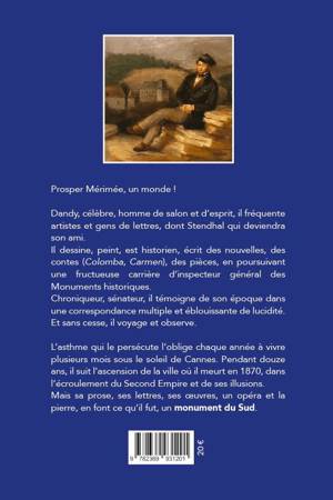 Prosper Mérimée, un monde ! Dandy, célèbre, homme de salon et d’esprit, il fréquente artistes et gens de lettres, dont Stendhal qui deviendra son ami. Il dessine, peint, est historien, écrit des nouvelles, des contes (Colomba, Carmen), des pièces, en poursuivant une fructueuse carrière d’inspecteur général des Monuments historiques. Chroniqueur, sénateur, il témoigne de son époque dans une correspondance multiple et éblouissante de lucidité. Et sans cesse, il voyage et observe. L’asthme qui le persécute l’oblige chaque année à vivre plusieurs mois sous le soleil de Cannes. Pendant douze ans, il suit l’ascension de la ville où il meurt en 1870, dans l’écroulement du Second Empire et de ses illusions. Mais sa prose, ses lettres, ses oeuvres, un opéra et la pierre, en font ce qu’il fut, un monument du Sud.