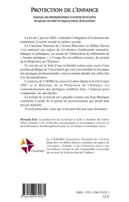 La loi du 2 janvier 2002 a introduit l'obligation d'évaluation des institutions d'action sociale et médico-sociale. Le Carrefour National de l'Action Educative en Milieu Ouvert s'est intéressé aux enjeux de l'évaluation, en amont de l'élaboration de référentiels de "bonnes pratiques" à l'usage des travailleurs sociaux, du secteur de la Protection de l'Enfance. L'association vise à reconnaître la mosaïque des pratiques professionnelles, tout en restant attentif aux effets liés à la décentralisation.