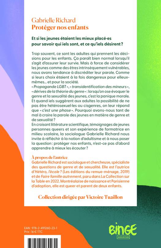 Trop souvent, ce sont les adultes qui prennent les décisions pour les enfants. Ça paraît bien normal lorsqu’il s’agit d’assurer leur survie. Mais à force de considérer les jeunes comme des êtres intrinsèquement vulnérables, nous avons tendance à discréditer leur parole. Comme si leurs choix étaient à la fois dangereux pour eux-mêmes… et pour la société. « Propagande LGBT », « transidentification des mineurs », « dérives de la théorie du genre » : lorsqu’on ose évoquer le genre et la sexualité des jeunes, c’est la panique morale. Et quand ils suggèrent aux adultes la possibilité de ne pas être hétérosexuels ou cisgenres, on leur répond que « c’est une phase ». Pourquoi avons-nous tant de mal à croire la parole des jeunes en matière de genre et de sexualité ? En croisant littérature scientifique, témoignages de jeunes personnes queers et son expérience de formatrice en milieu scolaire, la sociologue Gabrielle Richard nous invite à réfléchir à la notion d’adultisme et à nous poser la question : protéger nos enfants, n’est-ce pas d’abord apprendre à mieux les écouter ?
