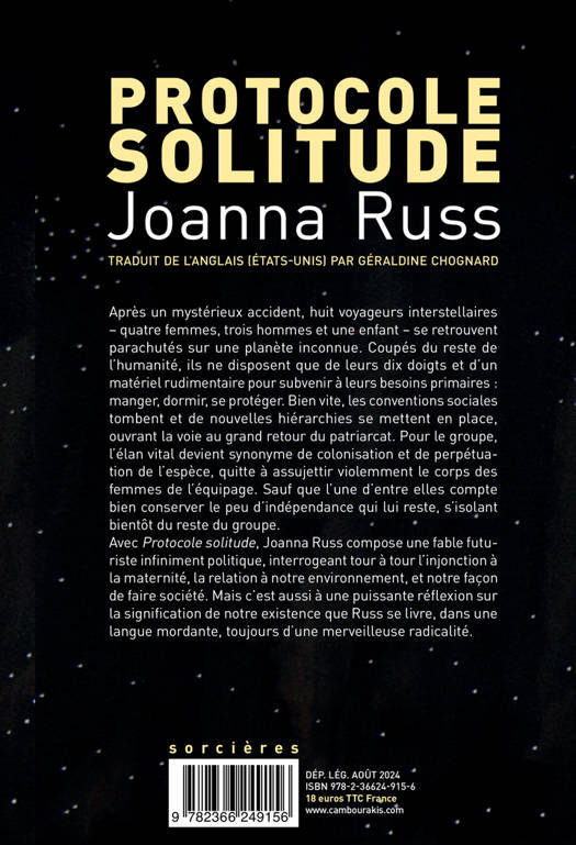 Après un mystérieux accident, huit voyageurs interstellaires - quatre femmes, trois hommes et une enfant - se retrouvent parachutés sur une planète inconnue. Coupés du reste de l'humanité, ils ne disposent que de leurs dix doigts et d'un matériel rudimentaire pour subvenir à leurs besoins primaires : manger, dormir, se protéger. Bien vite, les conventions sociales tombent et de nouvelles hiérarchies se mettent en place, ouvrant la voie au grand retour du patriarcat. Pour le groupe, l'élan vital devient synonyme de colonisation et de perpétuation de l'espèce, quitte à assujettir violemment le corps des femmes de l'équipage. Sauf que l'une d'entre elles compte bien conserver le peu d'indépendance qui lui reste, s'isolant bientôt du reste du groupe. Avec "Protocole solitude", Joanna Russ compose une fable futuriste infiniment politique, interrogeant tour à tour l'injonction à la maternité, la relation à notre environnement, et notre façon de faire société. Mais c'est aussi à une puissante réflexion sur la signification de notre existence que Russ se livre, dans une langue mordante, toujours d'une merveilleuse radicalité.