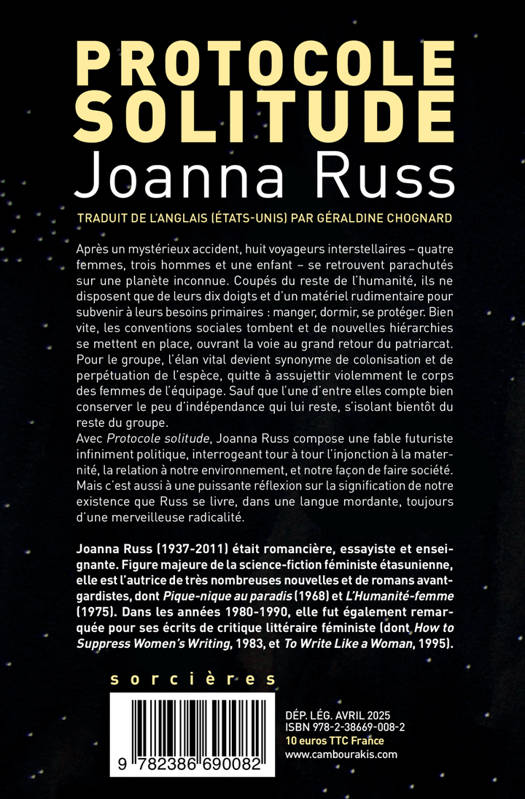 Après un mystérieux accident, huit voyageurs interstellaires - quatre femmes, trois hommes et une enfant - se retrouvent parachutés sur une planète inconnue. Coupés du reste de l'humanité, ils ne disposent que de leurs dix doigts et d'un matériel rudimentaire pour subvenir à leurs besoins primaires : manger, dormir, se protéger. Bien vite, les conventions sociales tombent et de nouvelles hiérarchies se mettent en place, ouvrant la voie au grand retour du patriarcat. Pour le groupe, l'élan vital devient synonyme de colonisation et de perpétuation de l'espèce, quitte à assujettir violemment le corps des femmes de l'équipage. Sauf que l'une d'entre elles compte bien conserver le peu d'indépendance qui lui reste, s'isolant bientôt du reste du groupe. Avec "Protocole solitude", Joanna Russ compose une fable futuriste infiniment politique, interrogeant tour à tour l'injonction à la maternité, la relation à notre environnement, et notre façon de faire société. Mais c'est aussi à une puissante réflexion sur la signification de notre existence que Russ se livre, dans une langue mordante, toujours d'une merveilleuse radicalité.
