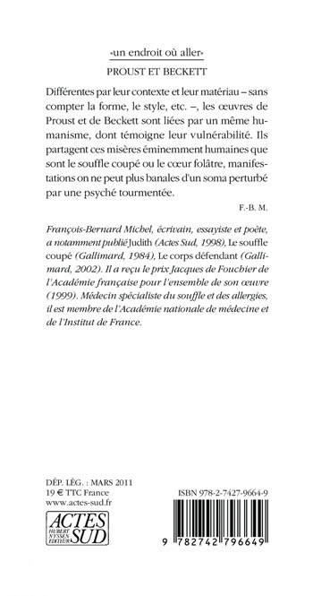 Différentes par leur contexte et leur matériau - sans compter la forme, le style, etc. -, les oeuvres de Proust et de Beckett sont liées par un même humanisme, dont témoigne leur vulnérabilité. Ils partagent ces misères éminemment humaines que sont le souffle coupé ou le coeur folâtre, manifestations on ne peut plus banales d'un soma perturbé par une psyché tourmentée.