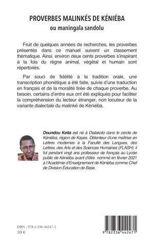 Fruit de quelques années de recherches, les proverbes présentés dans ce manuel suivent un classement thématique. Ainsi, environ deux cents proverbes s'inspirant à la fois du règne animal, végétal et humain sont répertoriés. Par souci de fidélité à la tradition orale, une transcription phonétique a été faite, suivie d'une traduction en français et de la moralité tirée de chaque proverbe. Au besoin, certains d'entre eux ont été expliqués pour faciliter la compréhension du lecteur étranger, non locuteur de la variante dialectale du malinké de Kéniéba.
