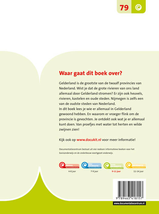 Gelderland is de grootste van de twaalf provincies van Nederland. Wist je dat de grote rivieren van ons land allemaal door Gelderland stromen? Er zijn ook heuvels, rivieren, kastelen en oude steden. Nijmegen is zelfs een van de oudste steden van Nederland. In dit boek lees je wie er allemaal in Gelderland gewoond hebben. En waarom er vroeger flink om de provincie is gevochten. Je ontdekt ook wat je er allemaal kunt doen. Van proefjes met water tot herten en wilde zwijnen zien!