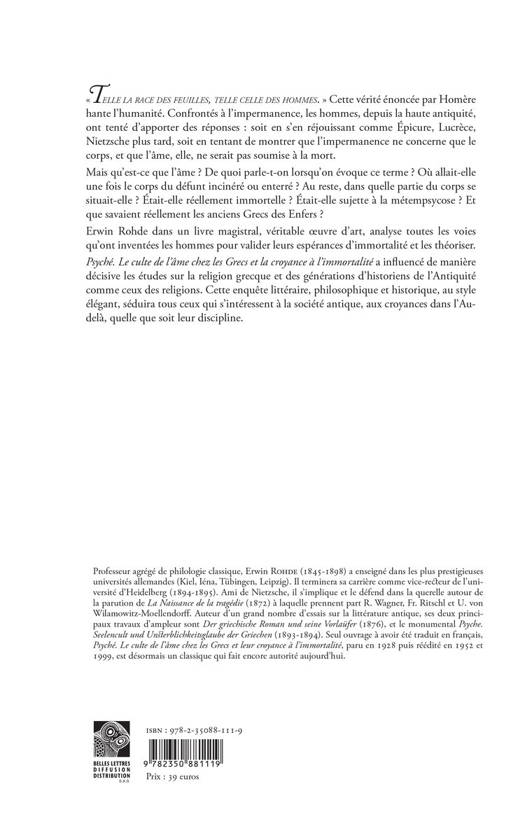 Psyché. Le culte de l’âme chez les Grecs et la croyance à l’immortalité a influencé de manière décisive les études sur la religion grecque et des générations d’historiens de l’Antiquité comme ceux des religions. Cette enquête littéraire, philosophique et historique, au style élégant, séduira tous ceux qui s’intéressent à la société antique, aux croyances dans l’Audelà, quelle que soit leur discipline.