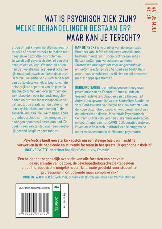 'Psychiatrie biedt een sterke kapstok om een stevige basis én inzicht te verwerven in de bepalende en sturende factoren in het geestelijk gezondheidsbeleid.' - INGE VERVOTTE | voorzitter Dagelijks Bestuur vzw Emmaüs 'Een helder en toegankelijk overzicht van alle facetten van het veld: de organisatie van de zorg, de psychopathologische ziektebeelden en de therapeutische mogelijkheden. Uitermate geschikt voor student en professional in dit boeiende maar complexe vak.' DIRK DE WACHTER | psychiater, auteur van Borderline Times en Vertroostingen