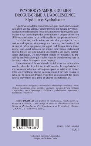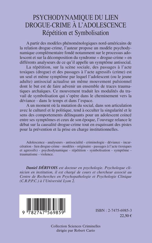 La répétition, sur la scène sociale, des passages à l'acte toxiques (drogue) et des passages à l'acte agressifs (crime) est un seul et même symptôme par lequel l'adolescent antisocial actualise un même mouvement pulsionnel dont le but est de faire advenir un ensemble de traces traumatiques archaïques. Ce mouvement traduit les modalités du travail de symbolisation qui s'opère dans le cheminement vers la déviance - dans le temps et dans l'espace. L'ouvrage relance le débat sur la causalité drogue-crime tout en esquissant des pistes pour la prévention et la prise en charge institutionnelles.