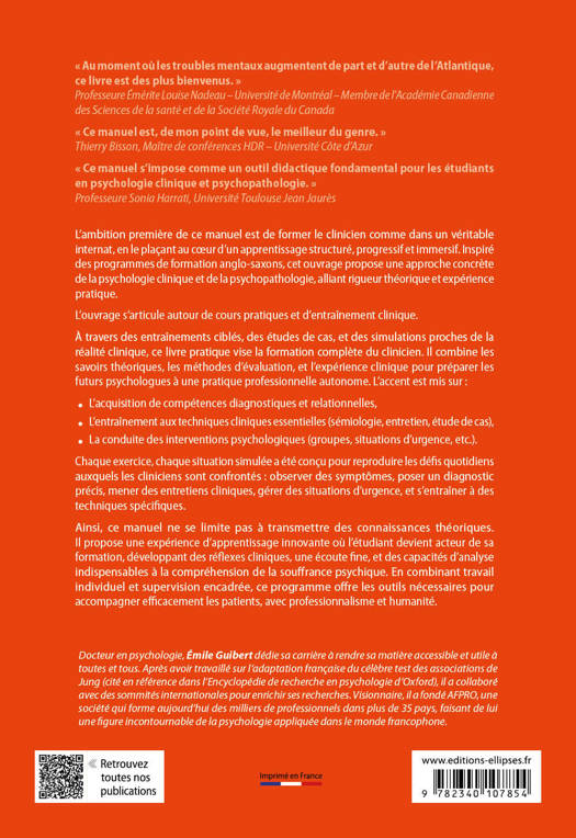L’ambition première de ce manuel est de former le clinicien comme dans un véritable internat, en le plaçant au cœur d’un apprentissage structuré, progressif et immersif. Inspiré des programmes de formation anglo-saxons, cet ouvrage propose une approche concrète de la psychologie clinique et de la psychopathologie, alliant rigueur théorique et expérience pratique.
