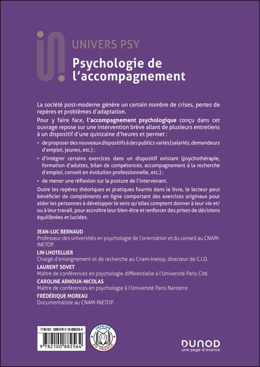 La société post-moderne génère un certain nombre de crises, pertes de repères et problèmes d’adaptation. Pour y faire face, l’accompagnement psychologique conçu dans cet ouvrage repose sur une intervention brève (allant d’un entretien à un dispositif d’une quinzaine d’heures) et permet : – de proposer des nouveaux dispositifs à des publics variés (salariés, demandeurs d’emploi, jeunes, etc.) ; – d’intégrer certains exercices dans un dispositif existant (psychothérapie, formation d’adultes, bilan de compétences, accompagnement à la recherche d’emploi, conseil en évolution professionnelle, etc.) ; – de mener une réflexion sur la posture de l’intervenant. Outre les repères théoriques et pratiques fournis dans le livre, le lecteur peut bénéficier de compléments en ligne comportant les exercices originaux pour aider les personnes à développer le sens qu’elles comptent donner à leur vie et/ou à leur travail, pour accroître leur bien-être et renforcer des prises de décisions équilibrées et lucides.