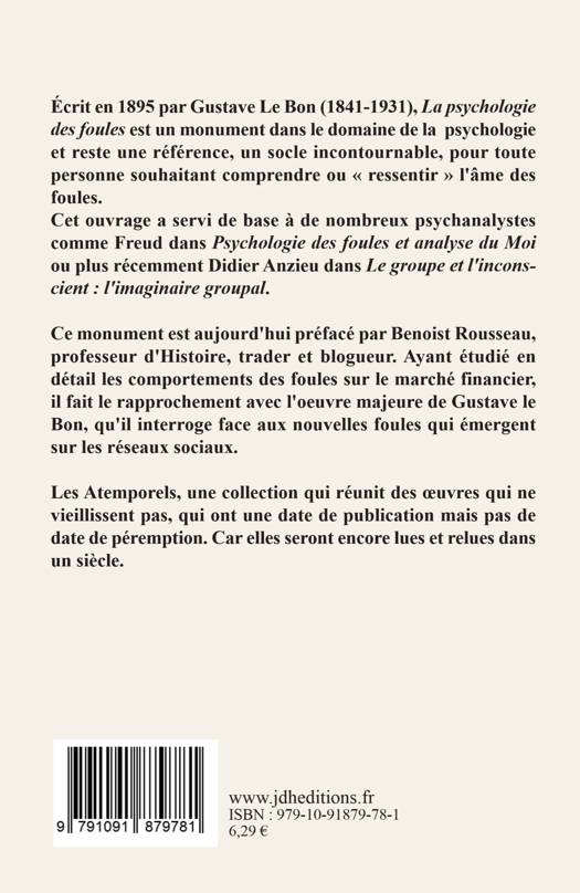 Ce monument est aujourd'hui préfacé par Benoist Rousseau, professeur d'Histoire, trader et blogueur. Ayant étudié en détail les comportements des foules sur le marché financier, il fait le rapprochement avec l'oeuvre majeure de Gustave le Bon, qu'il interroge face aux nouvelles foules qui émergent sur les réseaux sociaux.