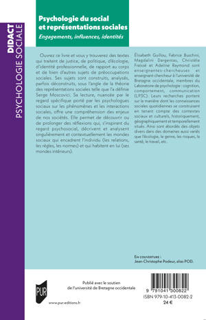 Ouvrez ce livre et vous y trouverez des textes qui traitent de justice, de politique, d’écologie, d’identité professionnelle, de rapport au corps et de bien d’autres sujets de préoccupations sociales. Ses sujets sont construits, analysés, parfois déconstruits, sous l’angle de la théorie des représentations sociales telle que l’a définie Serge Moscovici. Sa lecture, nuancée par le regard spécifique porté par les psychologues sociaux sur les phénomènes et les interactions sociales, offre une compréhension des enjeux de nos sociétés. Elle permet de découvrir ou de prolonger des réflexions qui, s’inspirant du regard psychosocial, décrivent et analysent singulièrement et contextuellement les mondes sociaux qui encadrent l’individu (les relations, les règles, les normes) et qui habitent en lui (ses mondes intérieurs).