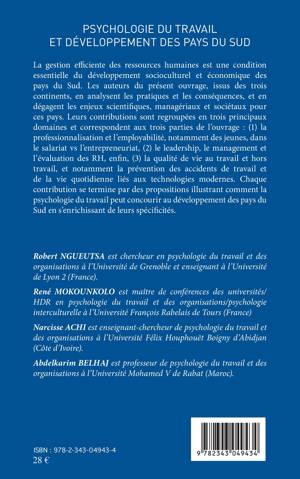 La gestion efficiente des ressources humaines est une condition essentielle du développement socioculturel et économique des pays du Sud. Ces contributions en analysent les pratiques et les conséquences, et en dégagent les enjeux scientifiques, managériaux et sociétaux. Elles s'intéressent à la professionnalisation et l'employabilité, notamment des jeunes, dans le salariat vs l'entrepreneuriat, au leadership, au management et à l'évaluation des RH, et à la qualité de vie au travail et hors travail.