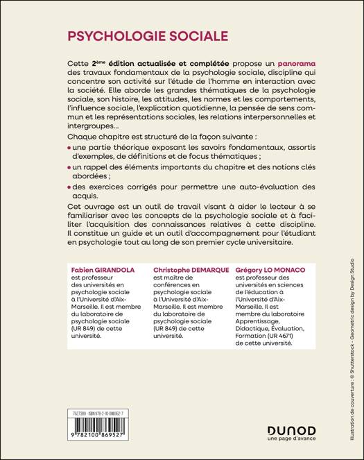 Cette 2èmeédition, actualisée et complétée, propose un panorama global et introductif à la psychologie sociale par une approche pédagogique innovante et contemporaine. Conçue sous l’angle de l’acquisition progressive de connaissances, elle permet d'assimiler les concepts fondamentaux de la discipline grâce au nombreux exemples et exercices corrigés facilitant leur acquisition.