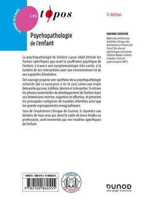 La psychopathologie de l’enfant a pour objet d’étude les formes spécifiques que revêt la souffrance psychique de l’enfant, à travers une symptomatologie très variée, à la lumière de ses interactions avec son environnement et de ses capacités d’évolution. Cet ouvrage propose une synthèse de la psychopathologie infantile (de la naissance à 10-12 ans) selon une triple démarche qui vise à définir, décrire et interpréter. Il retrace les phases essentielles du développement de l’enfant dans ses dimensions motrice, cognitive et affective, et présente les principales catégories de troubles infantiles ainsi que les grands regroupements nosographiques.
