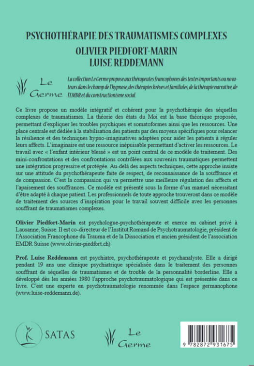 Une approche intégrative basée sur la théorie des états du moi et des techniques hypno-imaginatives. Ce livre propose un modèle intégratif et cohérent pour la psychothérapie des séquelles complexes de traumatismes. La théorie des états du Moi est la base théorique proposée, permettant d’expliquer les troubles psychiques et somatoformes ainsi que les ressources. Une place centrale est dédiée à la stabilisation des patients par des moyens spécifiques pour relancer la résilience et des techniques hypno-imaginatives adaptées pour aider les patients à réguler leurs affects.-nbsp; L’imaginaire est une ressource inépuisable permettant d’activer les ressources. Le travail avec «l’enfant intérieur blessé» est un point central de ce modèle de traitement. Des mini-confrontations et des confrontations contrôlées aux souvenirs traumatiques permettent une intégration progressive et protégée. Au-delà des aspects techniques, cette approche insiste sur une attitude du psychothérapeute faite de respect, de reconnaissance, de la souffrance et de compassion. C’est la compassion qui va permettre une meilleure régulation des affects et l’apaisement de souffrances. Ce modèle est présenté sous la forme d’un manuel nécessitant d’être adapté à chaque patient.-nbsp ; Les professionnels de toute approche trouveront dans ce modèle de traitement des sources d'inspiration pour le travail souvent difficile avec les personnes souffrant de traumatismes complexes.