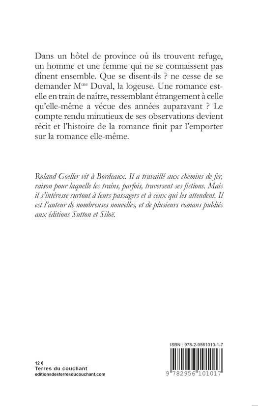 Dans un hôtel de province où ils trouvent refuge, un homme et une femme qui ne se connaissent pas dînent ensemble. Que se disent-ils ? ne cesse de se demander Mme Duval, la logeuse. Une romance est-elle en train de naître, ressemblant étrangement à celle qu’elle-même a vécue des années auparavant ? Le compte rendu minutieux de ses observations devient récit et l’histoire de la romance finit par l’emporter sur la romance elle-même.