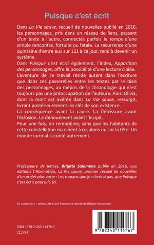 Dans La Vie sauve, recueil de nouvelles publié en 2016, les personnages, pris dans un réseau de liens, passent d'un texte à l'autre, connectés parfois le temps d'une simple rencontre, fortuite ou fatale. Dans Puisque c'est écrit également, l'auteure offre la possibilité d'une lecture ciblée. L'aventure de ce travail réside autant dans l'écriture que dans ces passerelles entre les textes par le biais des personnages, au mépris de la chronologie. Ce roman présente au lecteur un monde normal raconté autrement.