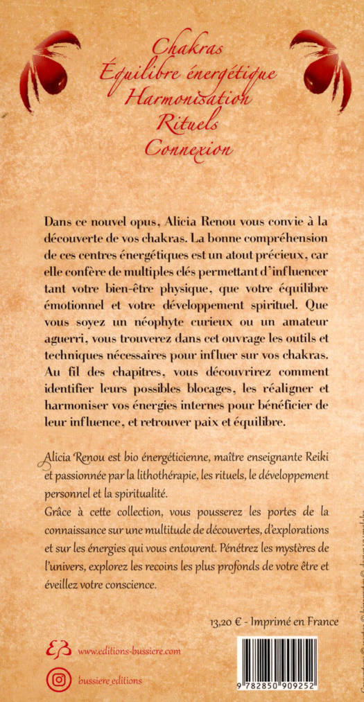 Dans ce nouvel opus, Alicia Renou vous convie à la découverte des chakras, ces centres d'énergie présents dans notre corps, et dont la compréhension regorge de clefs pour influencer votre bien-être, votre équilibre émotionnel et votre développement spirituel. Grâce à des descriptions et explications complètes, vous serez capables d'harmoniser vos énergies internes. Que vous soyez un néophyte curieux ou un amateur aguerri, vous trouverez dans ce livre les outils nécessaires pour maîtriser vos chakras et la manière dont ils peuvent vous être le plus bénéfique possible. En apprenant à identifier les blocages de vos chakras, vous pourrez, grâce aux diverses techniques livrées ici, les réaligner. Immergez-vous dans un vaste univers de spiritualité et percez les secrets d'une existence transformée, équilibrée et connectée !