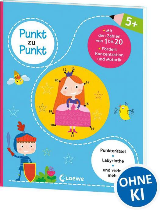 Kannst du schon von 1 bis 20 zählen? Dann zeichne alle Bilder fertig, indem du die Zahlen miteinander verbindest. Was für Dinge sich wohl hinter den Punkten verstecken? Doch es warten noch viel mehr Spiele auf dich. Spure Linien nach, ordne Schattenbilder richtig zu, finde den Weg durch vielfältige Labyrinthe und mache die bunten Bilder noch farbenfroher.