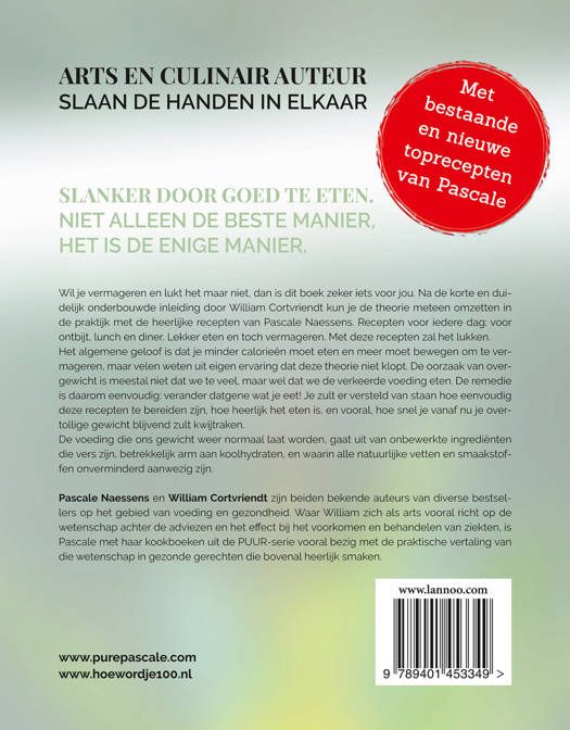 Met 59 bestaande en 15 nieuwe toprecepten van Pascale ARTS EN CULINAIR AUTEUR SLAAN DE HANDEN IN ELKAAR SLANKER DOOR GOED TE ETEN. NIET ALLEEN DE BESTE MANIER, HET IS DE ENIGE MANIER. Wil je vermageren en lukt het maar niet, dan is dit boek zeker iets voor jou. Na de korte en duidelijk onderbouwde inleiding door William Cortvriendt kun je de theorie meteen omzetten in de praktijk met de heerlijke recepten van Pascale Naessens. Recepten voor iedere dag: voor ontbijt, lunch en diner. Lekker eten en toch vermageren. Met deze recepten zal het lukken. Het algemene geloof is dat je minder calorieën moet eten en meer moet bewegen om te vermageren, maar velen weten uit eigen ervaring dat deze theorie niet klopt. De oorzaak van overgewicht is meestal niet dat we te veel, maar wel dat we de verkeerde voeding eten. De remedie is daarom eenvoudig: verander datgene wat je eet! Je zult er versteld van staan hoe eenvoudig deze recepten te bereiden zijn, hoe heerlijk het eten is, en vooral, hoe snel je vanaf nu je overtollige gewicht blijvend zult kwijtraken. De voeding die ons gewicht weer normaal laat worden, gaat uit van onbewerkte ingrediënten die vers zijn, betrekkelijk arm aan koolhydraten, en waarin alle natuurlijke vetten en smaakstoffen onverminderd aanwezig zijn.